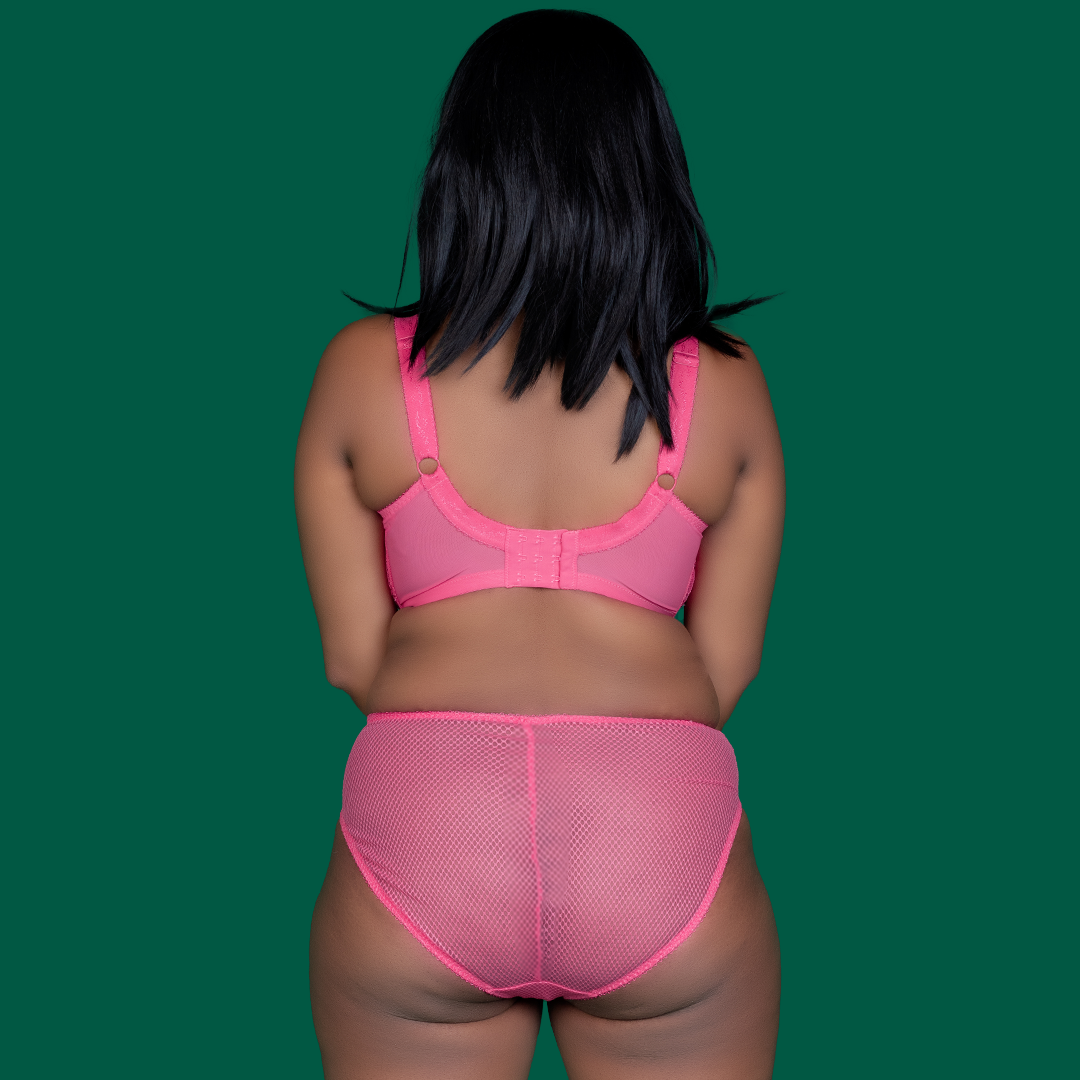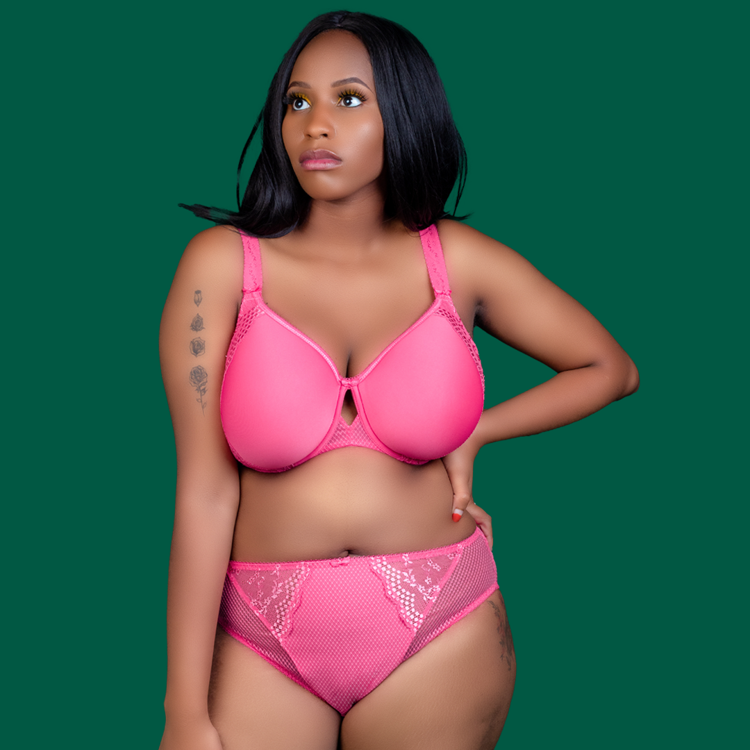 Pink, slightly padded underwire t-shirt bra. Offers full coverage, with a cute cut-out detail at the center.