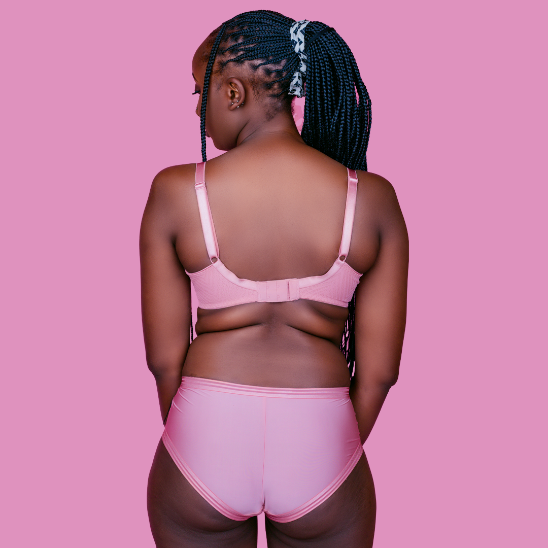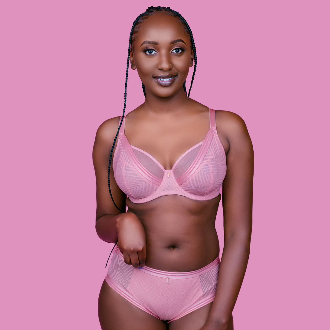 Chevron print, dusty pink, non-padded, underwire, high-apex, lace bra. Features a plunge design, which enhances appearance of cleavage and is ideal for wearing under outfits with plunging neckline designs.